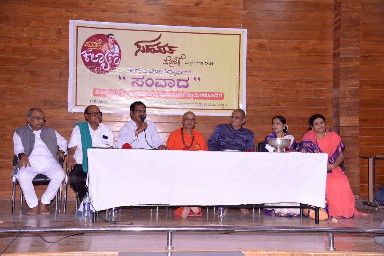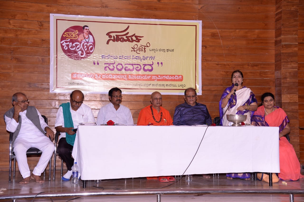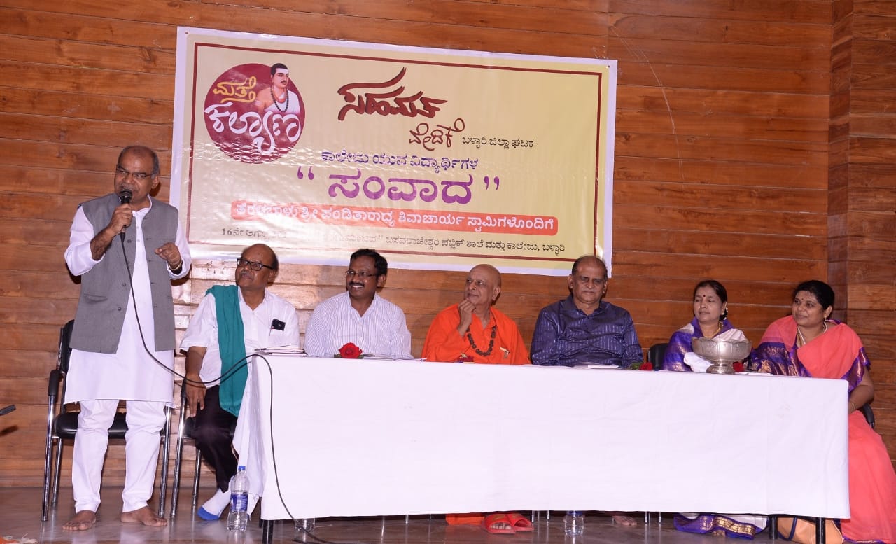ಆಗಸ್ಟ್ 16, ಬಳ್ಳಾರಿ; `ಮತ್ತೆ ಕಲ್ಯಾಣ’ದ ನಿಮಿತ್ತ ಇಲ್ಲಿನ ಬಸವರಾಜೇಶ್ವರಿ ಕಾಲೇಜಿನ ಶರಣ ಮಂಟಪದಲ್ಲಿ ಏರ್ಪಡಿಸಿದ್ದ ವಿದ್ಯಾರ್ಥಿಗಳೊಂದಿಗೆ ಸಂವಾದ ಕಾರ್ಯಕ್ರಮದಲ್ಲಿ ಶ್ರೀ ಪಂಡಿತಾರಾಧ್ಯ ಶಿವಾಚಾರ್ಯ ಸ್ವಾಮಿಗಳು ಪ್ರಶ್ನೆಗಳಿಗೆ ಉತ್ತರಿಸುತ್ತ ಮನುಷ್ಯ ಹುಟ್ಟುತ್ತ ವಿಶ್ವಮಾನವ, ಬೆಳೆದಂತೆ ಅಲ್ಪ ಮಾನವನಾಗುತ್ತಿದ್ದಾನೆ. ಬಾಲ್ಯದಲ್ಲಿ ಮಕ್ಕಳಿಗೆ ಕ್ರೂರ ಜೀವಜಂತುಗಳ ಮೇಲೂ ದ್ವೇಷವಿರುವುದಿಲ್ಲ. ಕ್ರಮೇಣ ದ್ವೇಷ, ಅಸೂಯೆ, ಸ್ವಾರ್ಥ ಮುಂತಾದವುಗಳನ್ನು ಬೆಳೆಸಿಕೊಳ್ಳುತ್ತ ತನ್ನ ಒಡಹುಟ್ಟಿದವರನ್ನೇ ದ್ವೇಷಿಸುವ ಹಂತಕ್ಕೆ ಬರುತ್ತಾನೆ. ಈ ಅಲ್ಪ ಮಾನವತೆಯಿಂದ ಮತ್ತೆ ವಿಶ್ವಮಾನವತೆಯ ಕಡೆಗೆ ಕರೆದುಕೊಂಡು ಹೋಗುವ ಮಾರ್ಗವೇ ‘ಮತ್ತೆ ಕಲ್ಯಾಣ’. ನಾವು ಎಂತಹ ಬಟ್ಟೆ ಧರಿಸುತ್ತೇವೆ ಎನ್ನುವುದು ಮುಖ್ಯವಲ್ಲ; ಯಾವ ಬಟ್ಟೆ(ದಾರಿ)ಯಲ್ಲಿ ನಡೆಯುತ್ತೇವೆ ಎನ್ನುವುದು ಬಹುಮುಖ್ಯ. ಕಾವಿ ತ್ಯಾಗದ ಸಂಕೇತ, ಖಾದಿ ಶುಭ್ರತೆಯ ಸಂಕೇತ, ಖಾಕಿ ಸಂರಕ್ಷಣೆಯ ಸಂಕೇತ. ಇವುಗಳ ಮಹತ್ವ ಮರೆತು ದಾರಿ ತಪ್ಪಿದ ವಾತಾವರಣ ಇಂದು ನಿರ್ಮಾಣ ಆಗಿದೆ. ಇಂಥ ಬಟ್ಟೆ ಧರಿಸಿದವರು ಸರಿಯಾಗಬೇಕಾದರೆ ಮೊದಲು ಅಂತರಂಗ ಶುದ್ಧಿ ನಂತರ ಬಹಿರಂಗ ಶುದ್ಧಿ ಮಾಡಿಕೊಳ್ಳಬೇಕು.