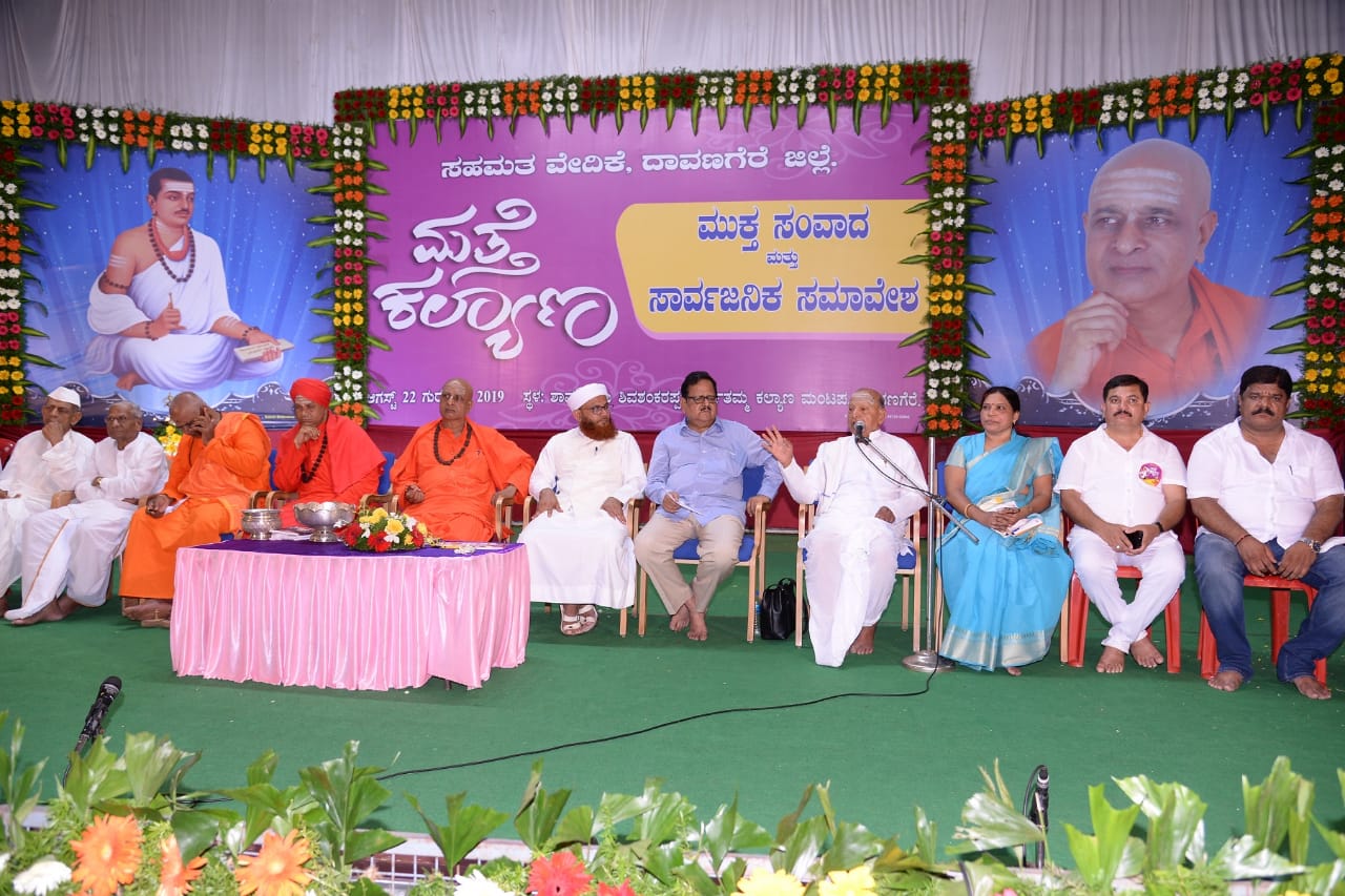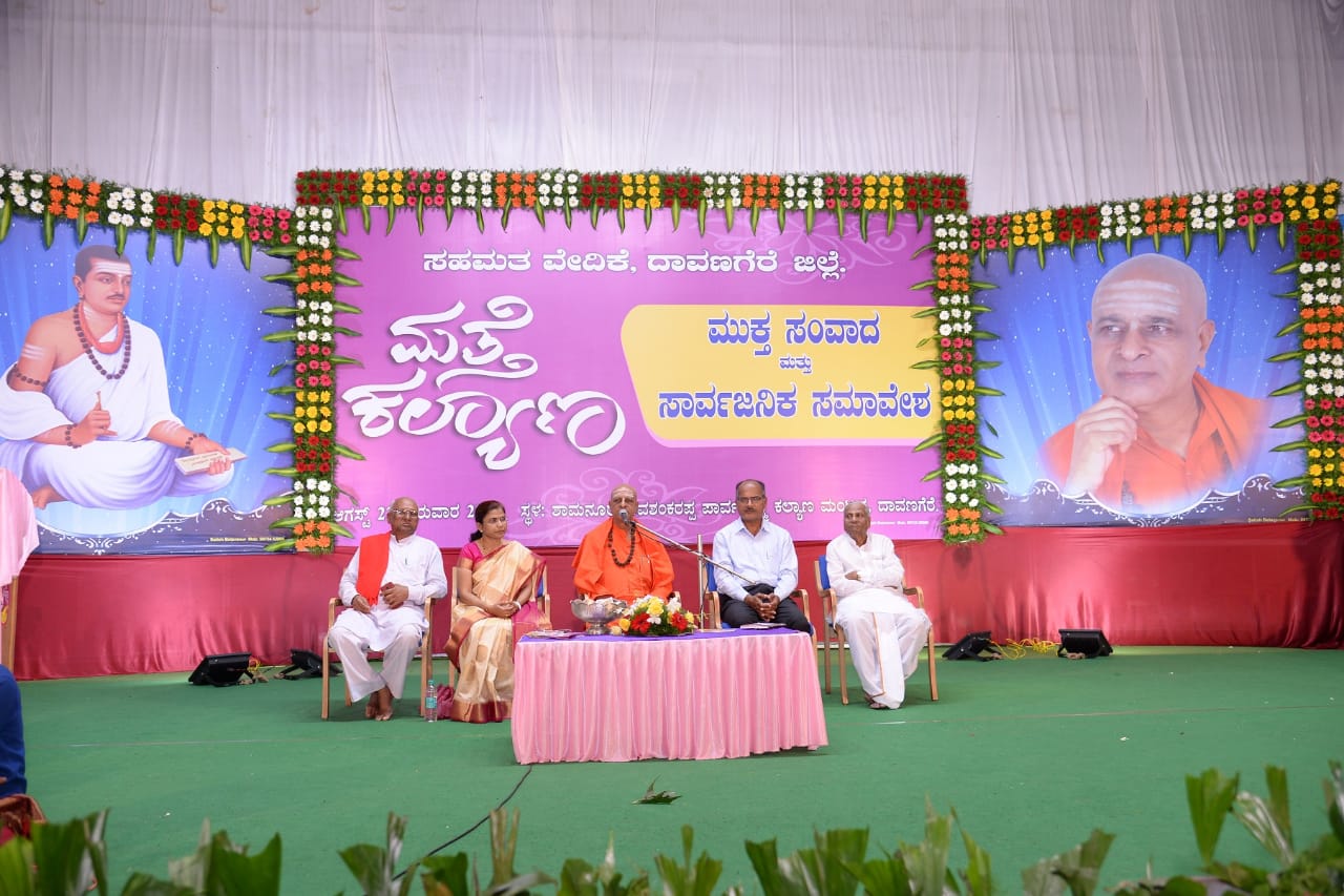 ಆಗಸ್ಟ್ 22; ದಾವಣಗೆರೆ; ಇಲ್ಲಿನ ಶಾಮನೂರು ಶಿವಶಂಕರಪ್ಪ ಕಲ್ಯಾಣ ಮಂಟಪದದಲ್ಲಿ `ಮತ್ತೆ ಕಲ್ಯಾಣ’ ಕಾರ್ಯಕ್ರಮದ ನಿಮಿತ್ತ ಏರ್ಪಡಿಸಿದ್ದ ವಿದ್ಯಾರ್ಥಿಗಳೊಂದಿಗೆ ಸಂವಾದ ಕಾರ್ಯಕ್ರಮದಲ್ಲಿ ಶ್ರೀ ಪಂಡಿತಾರಾಧ್ಯ ಶಿವಾಚಾರ್ಯ ಸ್ವಾಮಿಗಳು ಪ್ರಶ್ನೆಗಳಿಗೆ ಉತ್ತರಿಸಿ `ಮತ್ತೆ ಕಲ್ಯಾಣ’ ಶಿಸ್ತುಬದ್ಧವಾಗಿ ನಡೆಯುವ ಕಾರ್ಯಕ್ರಮ. ಇದು ಅಬ್ಬರದ ಕಾರ್ಯಕ್ರಮವಲ್ಲ; ಆದರ್ಶದ ಕಾರ್ಯಕ್ರಮ. 12 ನೆಯ ಶತಮಾನದ ಶರಣರು ಆದರ್ಶಗಳನ್ನು ಲೋಕಕ್ಕೆ ಹೇಳುವ ಮುನ್ನ ತಮಗೆ ತಾವೇ ಹೇಳಿಕೊಂಡರು, ಅದರಂತೆ ನಡೆದುಕೊಂಡರು. ಅನ್ಯರ ದೋಷಗಳನ್ನೇ ಪ್ರಮುಖವಾಗಿ ಹೇಳುವ ನಾವು ನಮ್ಮೊಳಗೆ ನೋಡಿಕೊಳ್ಳಬೇಕಿದೆ. 12 ನೆಯ ಶತಮಾನದ ಪೂರ್ವದಲ್ಲಿದ್ದ ಅಸಮಾನತೆಗಳಾದ ಜಾತಿ, ಲಿಂಗ ತಾರತಮ್ಯ, ಭ್ರಷ್ಟಾಚಾರಗಳು ಇಂದು ಮೇರೆ ಮೀರಿವೆ. ಸಮಸಮಾಜ ನಿರ್ಮಿಸುವ ಕಾಯಕದಲ್ಲಿ ಶರಣರು ಯಶಸ್ವಿಯಾಗಿದ್ದರು. ಆದರೆ ಇಂದು ಯಾಕೆ ಅದು ಸಾಧ್ಯವಾಗುತ್ತಿಲ್ಲ ಎಂದು ವಿವೇಚಿಸುವ ಕಾಲ ಕೂಡಿಬಂದಿದೆ. ನಾಳಿನ ನಾಡನ್ನು ಕಟ್ಟಬೇಕಾದವರು ಯುವ ಪೀಳಿಗೆ. ಯುವಕರು ಆಧುನಿಕ ತಂತ್ರಜ್ಞಾನದಿಂದ ದಿಕ್ಕುತಪ್ಪಿದ್ದಾರೆ, ಅವರಿಗೆ ಯಾರೂ ಹೇಳುವಂತಿಲ್ಲ, ಕೇಳುವಂತಿಲ್ಲ ಎಂದು ದೂರುವರು. ಆದರೆ ನಿಜಕ್ಕೂ ಆಶ್ಚರ್ಯದ ಸಂಗತಿ ವಿದ್ಯಾರ್ಥಿಗಳಲ್ಲಿ ಸದ್ಭಾವನೆಯಿದೆ. ಅವರಿಗೆ ಪ್ರೇರಣೆ ನೀಡಿದರೆ ಸಾಕು. ಆಧುನಿಕ ಶಿಕ್ಷಣ ಶರಣರನ್ನಾಗಿ ಮಾಡಬೇಕು. ದುರಾಚಾರಗಳು ಬಹುತೇಕ ನಡೆಯುತ್ತಿರುವುದೇ ವಿದ್ಯಾವಂತರಿಂದ. ಶಿಕ್ಷಣಕ್ಕಿಂತ ಸಂಸ್ಕಾರ ಮುಖ್ಯ. ಅರಿವು ಮತ್ತು ಆಚಾರಗಳು ಒಂದಾಗುವುದೇ ಸಂಸ್ಕಾರ. ಸಂಸ್ಕಾರದ ಕೊರತೆಯಿಂದಾಗಿ ಜನ ಮೌಢ್ಯಗಳಿಗೆ ಒಳಗಾಗುತ್ತಿದ್ದಾರೆ. ಸತ್ಯವನ್ನು ಆಡಬೇಕು ಎನ್ನುವುದ ಜ್ಞಾನ; ಅದರಂತೆ ನಡೆದುಕೊಳ್ಳುವುದೇ ಕ್ರಿಯೆ. ಆದರ್ಶಗಳು ಅರಳವುದು ಒಳಗೇ ಹೊರತು ಹೊರಗಲ್ಲ. ಮನವರಿಯದ ಕಳ್ಳತನವಿಲ್ಲ ಎನ್ನುವಂತೆ ಅಂತರಂಗವನ್ನು ಬೆಳಕಿನ ಕಡೆ ಕರೆದುಕೊಂಡು ಹೋಗುವುದೇ ಮತ್ತೆ ಕಲ್ಯಾಣ. ಪ್ರಾಥಮಿಕ ಹಂತದಿಂದ ವಿಶ್ವ ವಿದ್ಯಾಲಯದ ತನಕ ಎಲ್ಲ ವಿದ್ಯಾರ್ಥಿಗಳಿಗೆ ವಚನಗಳ ಪಠ್ಯದ ಅಳವಡಿಕೆ ಅಗತ್ಯ. ವಚನಗಳಲ್ಲಿ ಈಗಿನ ಕಾಲದಲ್ಲಿ ಅಧ್ಯಯನ ಮಾಡುತ್ತಿರುವ ಎಲ್ಲ ಶಾಸ್ತ್ರಗಳೂ ಅಡಕವಾಗಿವೆ. ವಿದ್ಯಾರ್ಥಿಗಳ ಪ್ರಶ್ನೆಗಳನ್ನು ಪ್ರೋತ್ಸಾಹಿಸಬೇಕೇ ವಿನಾ ಮೊಟುಕುವ ಕಾರ್ಯ ಮಾಡಬಾರದು. ಚನ್ನಬಸವಣ್ಣ ವಯಸ್ಸಿನಲ್ಲಿ ಕಿರಿಯರಾಗಿದ್ದರೂ ಬಸವಣ್ಣ, ಅಲ್ಲಮಪ್ರಭುವಿನಂತಹ ಹಿರಿಯರನ್ನು ಪ್ರಶ್ನಿಸುವರು. ಶರಣರು ಎಲ್ಲಾ ಅಸಮಾನತೆಗಳನ್ನು ದೂರಮಾಡಿದರು. ಅವರ ತತ್ವವಿಚಾರಗಳು ಎಂದೆಂದಿಗೂ ಪ್ರಸ್ತುತ. ಶಿಷ್ಯ ತನ್ನನ್ನು ಮೀರಿ ಬೆಳೆದರೆ ಗುರುವಿಗೆ ಆಗುವ ಸಂತೋಷ ಅಪರಿಮಿತ. ಈಗ ಅಂತಹ ಗುರು-ಶಿಷ್ಯರ ಅವಶ್ಯಕತೆ ಇದೆ. ಯಾವ ಸಮಾಜದಲ್ಲಿ ಉತ್ತಮ ಗುರುವಿಲ್ಲವೋ ಉತ್ತಮ ಶಿಷ್ಯರೂ ಇರುವುದಿಲ್ಲ. ಅಂತಹ ಸಮಾಜ ಮುಂದುವರಿಯಲು ಸಾಧ್ಯವಿಲ್ಲ. ಶರಣರು ದೇಹವೇ ದೇವಾಲಯ ಮಾಡಿಕೊಂಡು ದೇವಾಲಯದ ಭ್ರಮೆಯಿಂದ ಹೊರಬಂದವರು. ದುಶ್ಚಟಗಳಿಂದ ದೂರವಾಗಲು ಸಜ್ಜನರ ಸಂಗ ಅತಿ ಅವಶ್ಯ. ಶರಣರಿಗೆ ಯಾವುದೇ ಜಾತಿಯಿಲ್ಲ. ಅವರ ಜಾತಿ ಮಾನವ ಜಾತಿ.