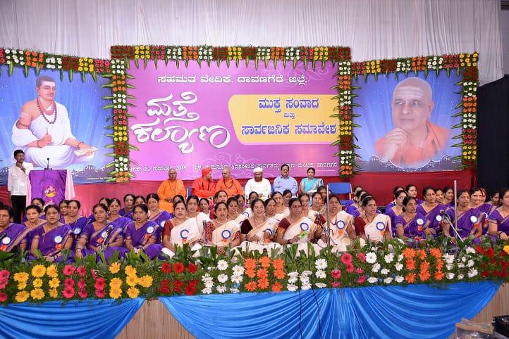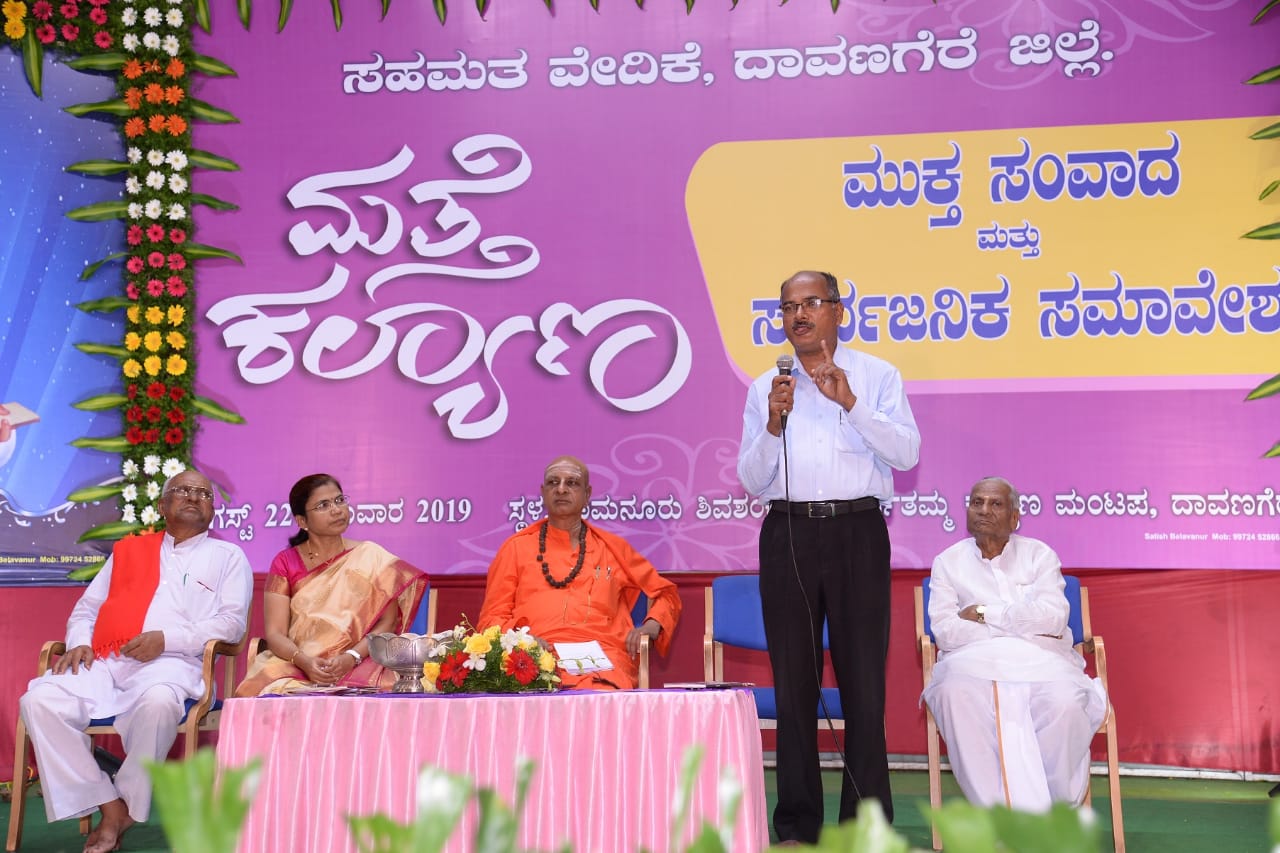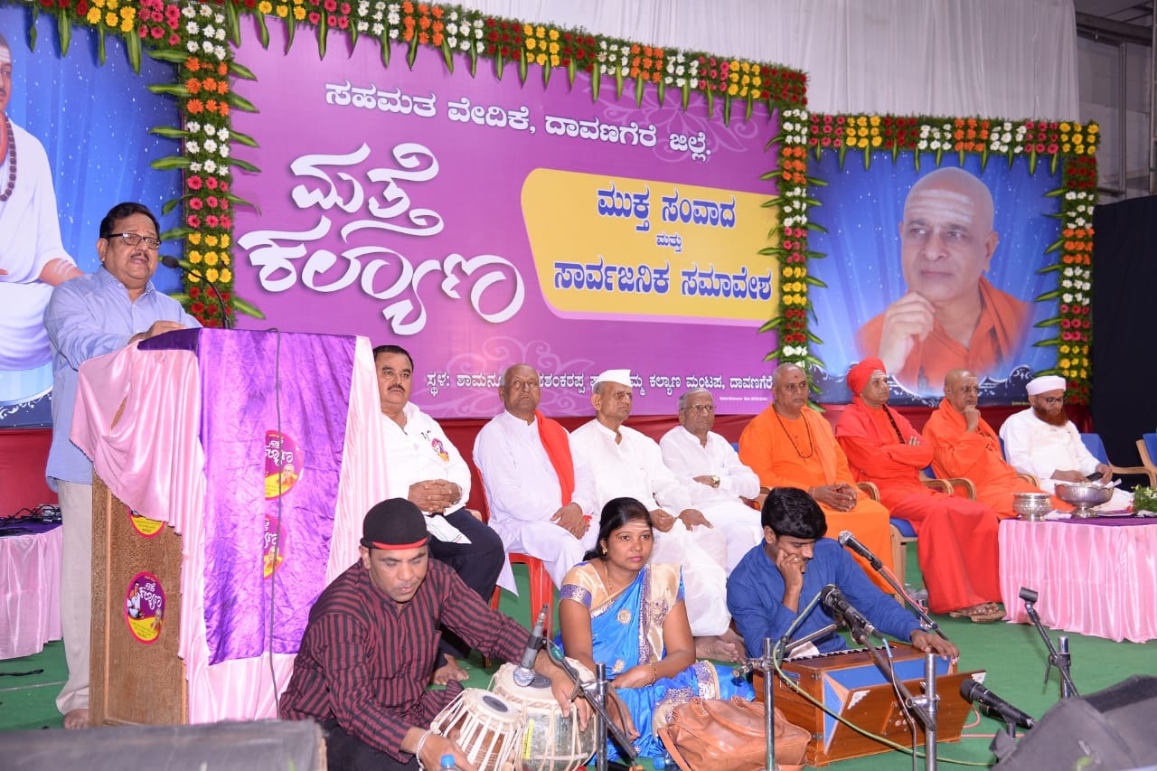 ಇಲ್ಲಿನ ಶ್ರೀ ಶಾಮನೂರು ಶಿವಶಂಕರಪ್ಪ ಪಾರ್ವತಮ್ಮ ಕಲ್ಯಾಣ ಮಂಟಪದದಲ್ಲಿ `ಮತ್ತೆ ಕಲ್ಯಾಣ’ ಅಭಿಯಾನದ ಅಂಗವಾಗಿ ಆಯೋಜಿಸಿದ್ದ ಸಾರ್ವಜನಿಕ ಸಮಾವೇಶದ ನೇತೃತ್ವ ವಹಿಸಿದ್ದ ಶ್ರೀ ಪಂಡಿತಾರಾಧ್ಯ ಶಿವಾಚಾರ್ಯ ಸ್ವಾಮಿಗಳು ಮಾತನಾಡಿ ಉದ್ಯೋಗಕ್ಕೆ ಜಾತಿಯನ್ನು ಹಚ್ಚಿದ್ದರ ಪರಿಣಾಮ ಗುಡಿಕೈಗಾರಿಕೆಗಳು ನಿಂತು ಹೋಗಿವೆ. ಹುಟ್ಟಿದ ಕಾರಣಕ್ಕೆ ಜಾತಿ ಅಂಟಿದೆ. ಮನಸ್ಸು ಮಾಡಿದರೆ ಅಂಟಿದ ಜಾತಿಯನ್ನು ಕಳಚಿ ಮಹಾತ್ಮರಾಗಲು ಸಾಧ್ಯ. ಇದಕ್ಕೆ ವಿಶ್ವಬಂಧು ಮರುಳಸಿದ್ಧರೇ ನಿದರ್ಶನ. ಬಸವಣ್ಣ ಮಾದಾರ ಚೆನ್ನಯ್ಯ, ಡೋಹರ ಕಕ್ಕಯ್ಯನಿಂದ ಭಿಕ್ಷೆ ಪಡೆದ ಕಾರಣ ಎನ್ನ ಭಕ್ತಿಯ ಪಾತ್ರೆ ತುಂಬಿತು ಎನ್ನುವರು. ಜಾತಿಯನ್ನು ಕೇವಲ ತೊರಿಕೆಗಷ್ಟೇ ಅಲ್ಲ; ಅಂತರಂಗದಿಂದಲೇ ಹೊರಹಾಕಬೇಕು. ರಕ್ತ ಬೇಕಾದಾಗ ರಕ್ತದ ಗುಂಪುಗಳನ್ನು ನೋಡುತ್ತೇವೆಯೇ ಹೊರತು ಜಾತಿ ನೋಡುವುದಿಲ್ಲ. ಒಳಗೆ ಸಂಚರಿಸುವ ರಕ್ತ ಒಂದೇ ಆಗಿರುವಾಗ ಒಟ್ಟಿಗೆ ಬಾಳಲು ಜಾತಿಯ ಅಡ್ಡಗೋಡೆಗಳೇಕೆ ಬೇಕು? ಅಸಾಧ್ಯ ಎನ್ನುವುದು ಮೂರ್ಖರ ಶಬ್ದಕೋಶದಲ್ಲಿ ಮಾತ್ರ ಇರುತ್ತದೆ. ಮೊದಲು ನಾನೊಬ್ಬ ಬದಲಾದರೆ ಸಾಕು ಸಮಾಜ ತನ್ನಿಂದ ತಾನೇ ಸುಧಾರಿಸುವುದು. ಬಸವಣ್ಣ ಹೋರಾಟ ಶುರು ಮಾಡಿದ್ದು ತನ್ನ 8 ನೆಯ ವಯಸ್ಸಿನಲ್ಲಿ. ಅಕ್ಕನಿಗಿಲ್ಲದ ಜನಿವಾರ ನನಗೇಕೆ ಬೇಕು ಎಂದು ಕೇಳುವ ಮೂಲಕ. ಬಸವಣ್ಣ ಜಗತ್ತಿನ ಮೊಟ್ಟಮೊದಲ ಸ್ತ್ರೀವಾದಿ. ಬಸವಣ್ಣನ ತತ್ವಗಳನ್ನು ಪುನರುಚ್ಚಾರ ಮಾಡುವ ನಾವು ಅವುಗಳನ್ನು ಅನುಸರಿಸದೇ ಇದ್ದರೆ ಹೇಗೆ? ಲೋಕಕಲ್ಯಾಣಕ್ಕೆ ಮುನ್ನ ಆತ್ಮಕಲ್ಯಾಣವಾಗಬೇಕು. ವಚನಗಳು ಪ್ರದರ್ಶನದ ಸರಕಾಗಬಾರದು. ಶರಣರು ಒಳಗೊಂದು-ಹೊರಗೊಂದು ಇರಲಿಲ್ಲ. ದೇವರನ್ನು ಒಲಿಸುವ ದಾರಿ; ಅಂತರಂಗ-ಬಹಿರಂಗ ಶುದ್ಧಿ ಎಂದು ಬಲವಾಗಿ ನಂಬಿದ್ದರು, ಅದಂತೆ ನಡೆದುಕೊಂಡರು. ಬಸವಣ್ಣನ ಸಪ್ತಶೀಲಗಳನ್ನು ಬದುಕಿನಲ್ಲಿ ಜಾರಿಗೆ ತಂದರೆ ದೇವರನ್ನು ಹುಡುಕಿಕೊಂಡು ಯಾರೂ ಗುಡಿಗಳಿಗೆ ಹೋಗುವ, ಹೊಸದಾಗಿ ಗುಡಿಕಟ್ಟಿಸುವ ಅವಶ್ಯಕತೆಯಿಲ್ಲ. ಬಸವಾನುಯಾಯಿಗಳು ಗುಡಿಯ ಹಂಗಿನಿಂದ ಹೊರಬಂದು ದೇಹವನ್ನೇ ಗುಡಿ ಮಾಡಿಕೊಳ್ಳಬೇಕು. ದೇಹ ಗುಡಿಯಾದರೆ ಅನಾಚಾರಗಳೆಲ್ಲ ಓಡಿಹೋಗುವವು. ಸಾಮಾಜಿಕ ರೋಗಗಳಿಗೆ ಇದೇ ಮದ್ದು. ಶರಣರ ಆದರ್ಶಗಳನ್ನು ಬೆಳಸಿಕೊಂಡರೆ ಮತ್ತೆ ಕಲ್ಯಾಣ ಸಾಧ್ಯವಾಗುವುದು. ಕಲ್ಯಾಣ ಎಂದರೆ ಮದುವೆ ಮಾಡಿಕೊಳ್ಳುವುದು ಅಥವ ಕಲ್ಯಾಣ ನಗರಕ್ಕೆ ಹೋಗುವುದು ಎಂದಲ್ಲ. ಮನಸ್ಸಿನ ಕೊಳೆ ತೊಳೆಯುವುದು ಅಷ್ಟು ಸುಲಭವಲ್ಲ. ಶರಣರೊಡನೆ ಅನುಭಾವ ಮಾಡುವುದರಿಂದ ಮನಸ್ಸಿನಲ್ಲಿ ಅಡಗಿರುವ ಕಾಮ, ಕ್ರೋಧ, ಮೋಹ, ಮದ, ಮತ್ಸರ ಮುಂತಾದ ಕೊಳೆಯನ್ನು ತೊಳೆದುಕೊಳ್ಳಲು ಸಾಧ್ಯ. ಬಸವಣ್ಣನನ್ನು ಬಿಟ್ಟು ಜಗತ್ತೇ ಇಲ್ಲ. ಕತ್ತಲೆಯಲ್ಲಿಯೂ ಬೆಳಕನ್ನು ನೀಡುವ ಶಕ್ತಿ ವಚನಗಳಿಗಿದೆ. ಮಕ್ಕಳಿಗೆ ವಚನ ಸಂಸ್ಕಾರ ಬೆಳಸುವ ಬಹುದೊಡ್ಡ ಜವಾಬ್ದಾರಿ ಪೋಷಕರ ಮೇಲಿದೆ. ಅದರಲ್ಲೂ ಕನ್ನಡದ ನೆಲದಲ್ಲಿ ವಾಸಿಸುವ ನಮಗೆ ಕರ್ತವ್ಯವಾಗಬೇಕು. ಬದುಕಿನಲ್ಲಿ ಹೊಸ ಬೆಳಕನ್ನು ವಚನಗಳಿಂದ ಕಾಣಲು ಸಾಧ್ಯ. ಹಣ ಸಂಪಾದಿಸಲು ಆದರ್ಶಬೇಕಿಲ್ಲ; ಸಾರ್ಥಕ ಬದುಕ ಬದುಕಲು ಆದರ್ಶಗಳು ಬೇಕು. ಹಣದ ಹಿಂದೆ ಓಡುತ್ತ ಬದುಕನ್ನು ನರಕ ಮಾಡಿಕೊಳ್ಳುತ್ತಿದ್ದೇವೆ. ಮಕ್ಕಳ ಜೊತೆಗಿನ ಸಂವಾದದಲ್ಲಿ ನಮ್ಮ ತಪ್ಪಿನ ಅರಿವಾಗುತ್ತದೆ. ಮಕ್ಕಳು ದಾರಿಬಿಟ್ಟಿಲ್ಲ; ಪೋಷಕರು ದಾರಿ ಬಿಟ್ಟಿದ್ದಾರೆ. ತಪ್ಪು ಮಾಡಿದವರ ಕಡೆ ಬೆರಳು ತೋರಿಸದೆ; ತಮ್ಮ ಅಂತರಂಗದ ಒಳ